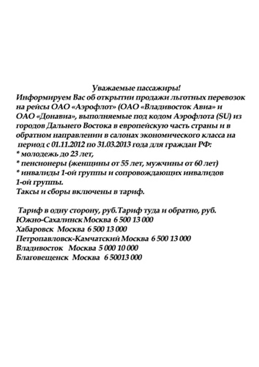 Уважаемые пассажиры! Открылось предварительное бронирование по субсидированным тарифам для пассажиров граждан РФ в возрасте до 23 лет, женщин в возрасте свыше 55 лет, мужчин в возрасте свыше 60 лет на рейсы авиакомпании 'Трансаэро' между Москвой/Санкт-Петербургом и пунктами полетов на Дальнем Востоке для перевозок в период с 01 апреля 2013 г. по 31 октября 2013 г.