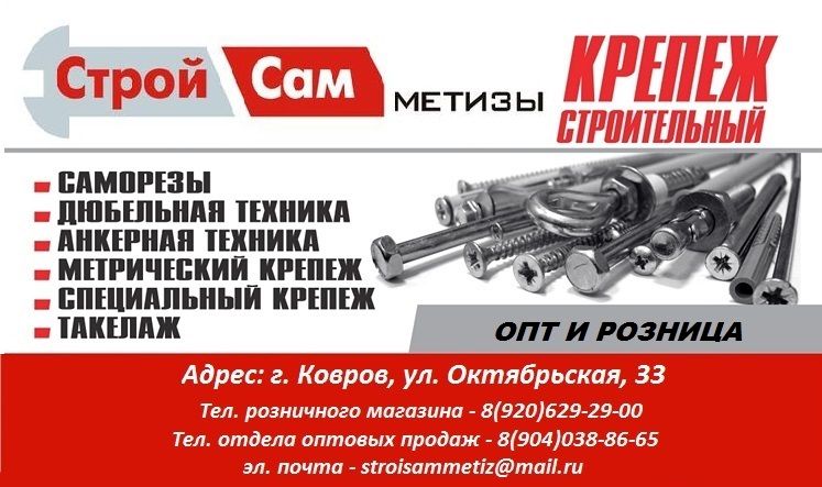 Стройсам Метизы - магазин метизов, крепежа и инструмента с низкими ценами, огромным выбором и высоким качеством. Болты, шурупы, саморезы по дереву и по металлу, кровельные саморезы, саморезы с пресшайбой, шпильки, гайки, цепи и троса, такелаж и многое другое. ОПТ И РОЗНИЦА