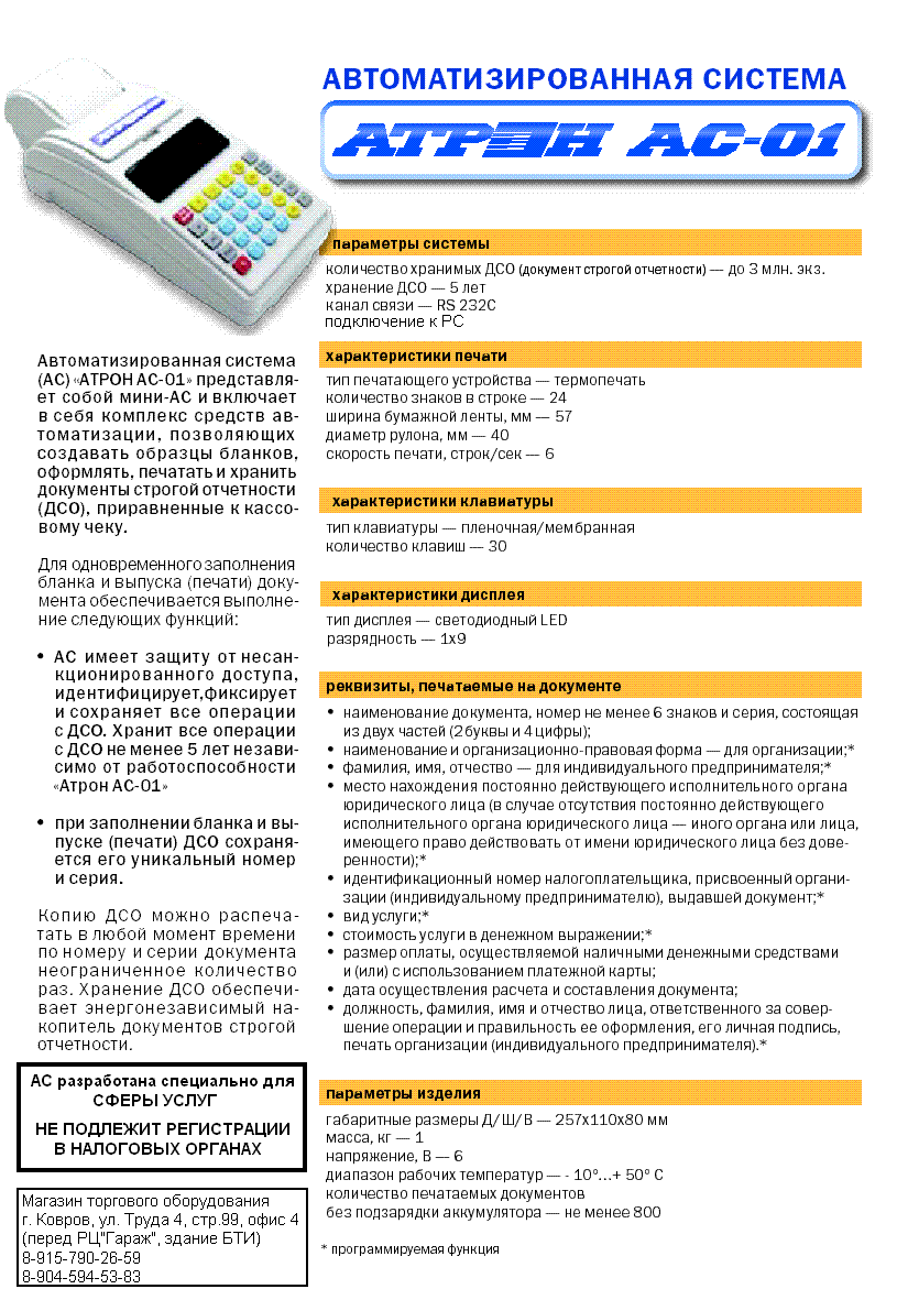 - АС «АТРОН АС-01» (самое дешёвое и надёжное решение) Автоматизированная система формирования бланков строгой отчетности для организаций и предпринимателей работающих в сфере услуг с использованием бланков строгой отчетности. Система построена на базе ККМ «ОКА МК» с дополнительным блоком памяти обеспечивающим хранение каждой расчетной информации об услуге в течении 5 лет и одобрена Минфином РФ. Работает в автономном режиме или в среде «1С» Полностью соответствует постановлению правительства РФ №359 от 06.05.2008 г..