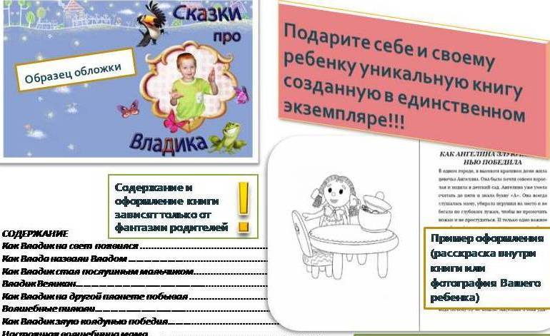 Уникальная книга со сказками для Вас и Вашего ребенка. Выпускается в единственном экземпляре. В книге 15 сказок с участием родителей, малыша, друзей и родственников, Стихи, Загадки. В книге также имеются цветные иллюстрации и расскраски к сказкам (возможно вставки с фотографиями). Оформление книги зависит от фантазии родителей. На обложке книги будет фотография вашего малыша.