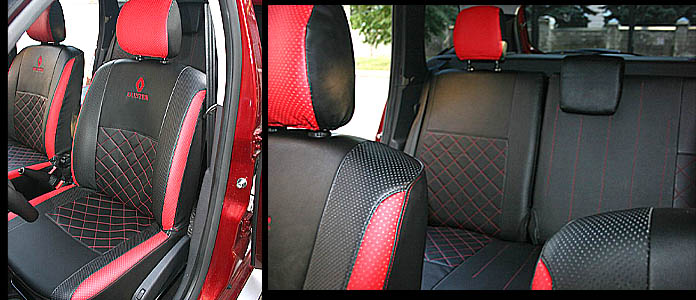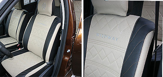 Чехлы на Рено Сандеро в стиле "Наска".    Бежевая и чёрная экокожа+ стилизованная отстрочка терракотовой нитью.