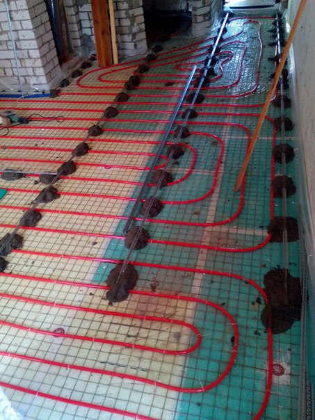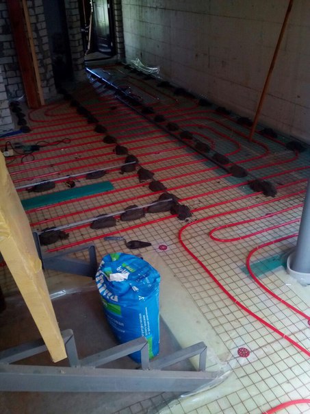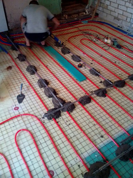 В одном из частных домов был произведен монтаж "теплого" пола, который разделен на три контура. Температура каждого контура регулируется отдельно. После чего была залита песчано-цементная стяжка, по маякам, точно в уровень.