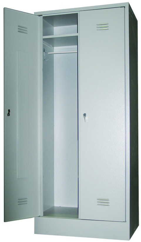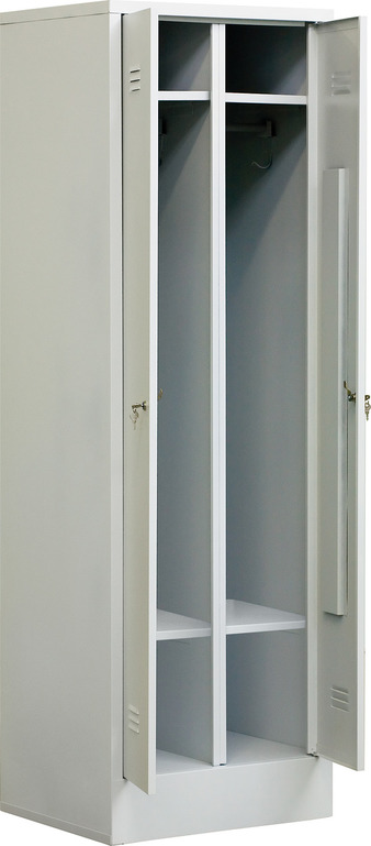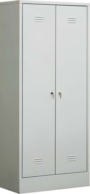 - Двери двухстворчатого металлического шкафа для одежды выполнены с двумя блоками вентиляционных отверстий.